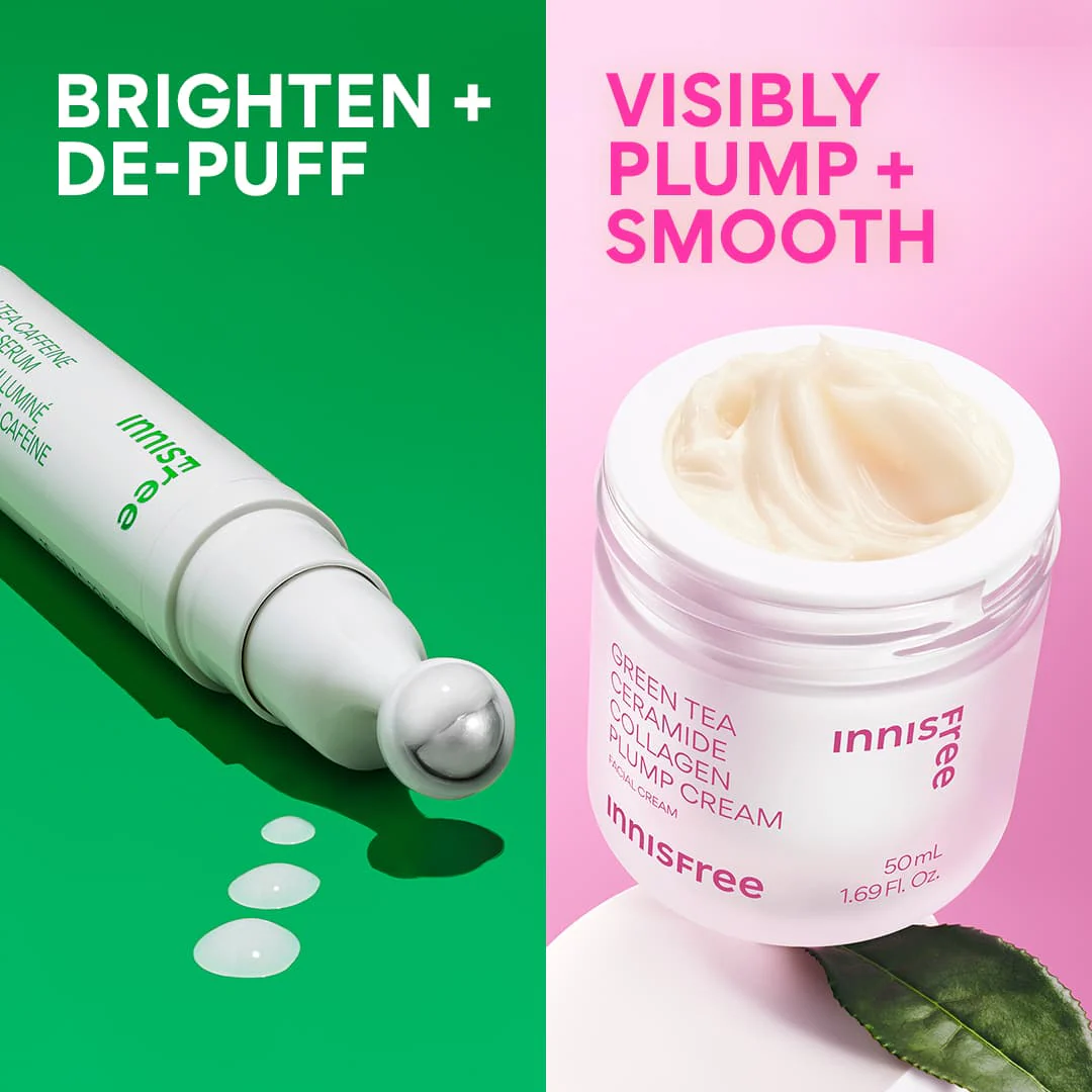 Meet your new go-to duo for plumping skin + de-puffing under eyes. This bundle includes a full size Green Tea Ceramide Collagen Plump Cream and a full size Green Tea Caffeine Bright-Eye Serum. Apply the Green Tea Eye Serum with the metal rollerball to brighten and de-puff tired eyes. Then, apply Green Tea Collagen Cream for visibly bouncy, plump skin.